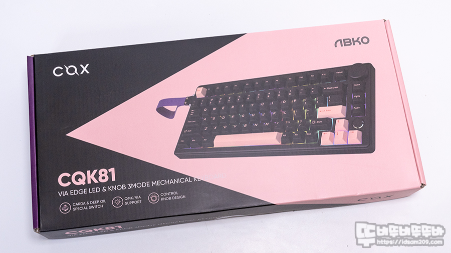 COX CQK81 패키지에는 제품의 이미지와 모델명 그리고 VIA, 엣지 LED, 노브, 3모드 기계식 키보드 그리고 특수축인 CARDA & DEEP OIL 스위치, QMK/VIA 지원 등 제품의 특징을 잘 표현하고 있습니다.