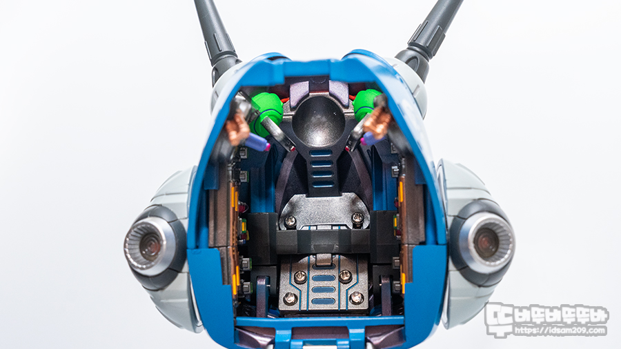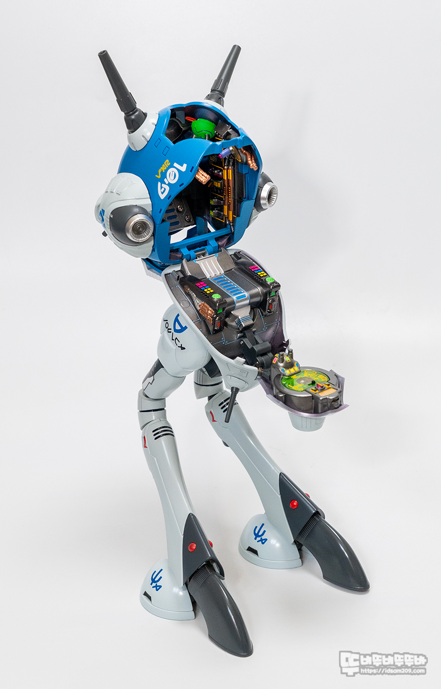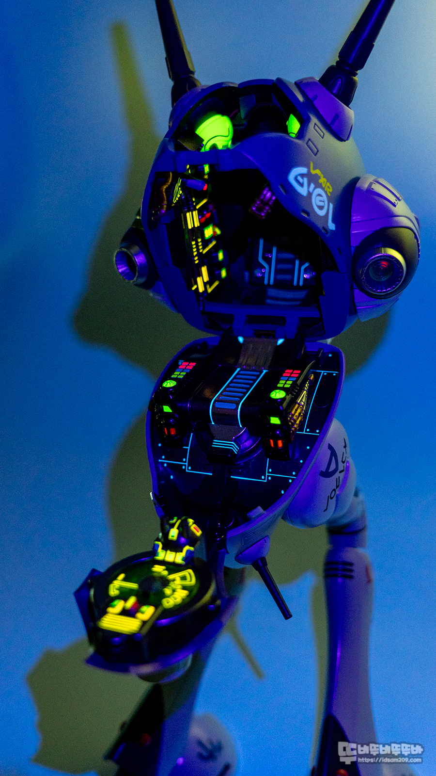 제가 기억하는 애니메이션 설정은 위와 같은 앉은 자세에서 등부분의 햇치를 열고 탔던 걸로 기억하는데 키즈컨셉에서는 전면 오픈 기믹을 적용하고 외장에 LED 발광 그리고 코크핏 내부에 전자장치는 UV 라이트에 반응하는 도료 코팅이 적용되어 디테일 끝판왕임을 증명하고 있습니다.