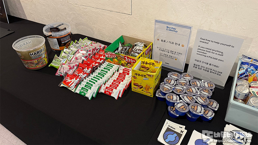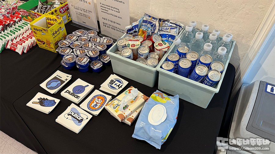입구쪽에 배치된 펄사 스티커와 다양한 음료 및 다과 모습.
