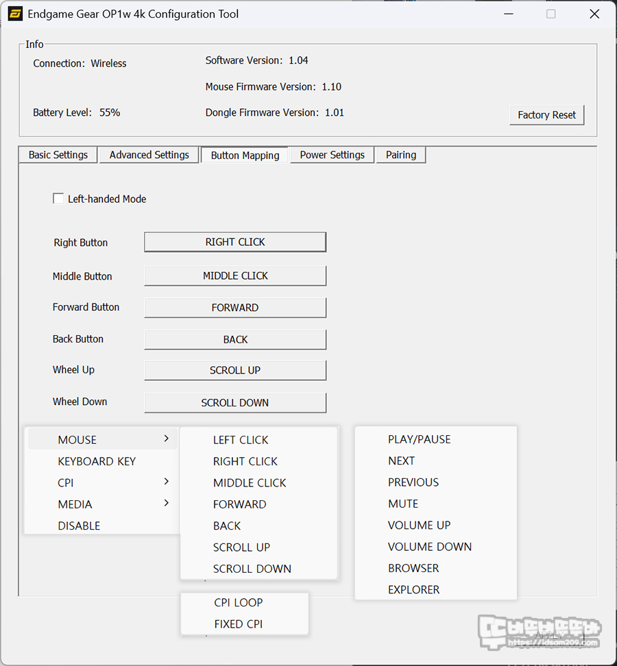마지막으로 파워 세이빙 및 딥 슬립 기능 설정과 무선 동글 페어링, 팩토리 리셋과 배터리 잔량을 %로 표현하여 직관적인 확인이 가능하니 참고하시면 좋습니다.