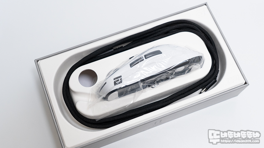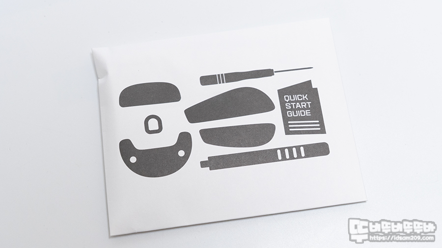 제품은 OP1w 마우스 본체, USB-C to A 파라코드 케이블, 4K 무선 리시버 그리고 봉투에 담긴 구성품으로 교체용 피트 (넓은 사이즈), 사이드 그립 테이프, 스위치 교체 작업 시 필요한 전용 드라이버, 사용 설명서, 실리콘 케이블 타이로 구성되어 있습니다.