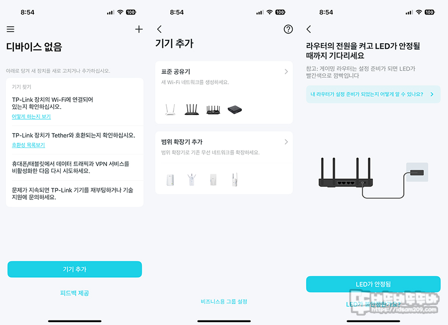 공유기 설정을 편리하게 도와주면서 간편하게 관리할 수 있는 Tether 앱을 실행 시 "기기추가" - "표준 공유기" - "LED가 안정됨"을 눌러 순차적으로 진행하게 되는데요.