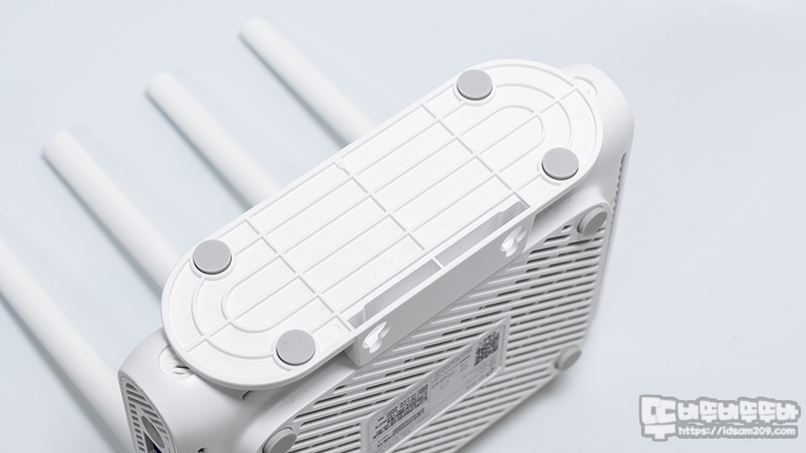 바닥면에는 미끄럼 방지 패드와 Wi-Fi SSID와 비번 초기값이 인쇄된 라벨 정보가 있어 공유기 초기 세팅에 도움이 될 수 있지만 Tether 앱이나 관리자 모드 접속 시 기본적으로 보안을 목적으로 새로 세팅하게 됩니다.
