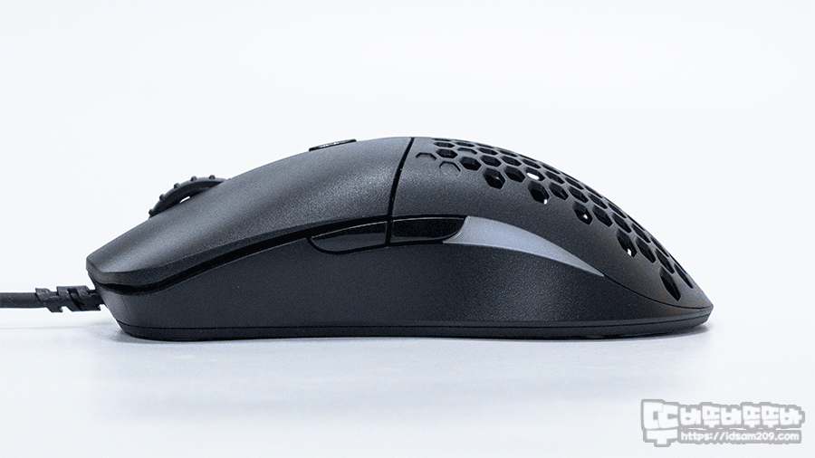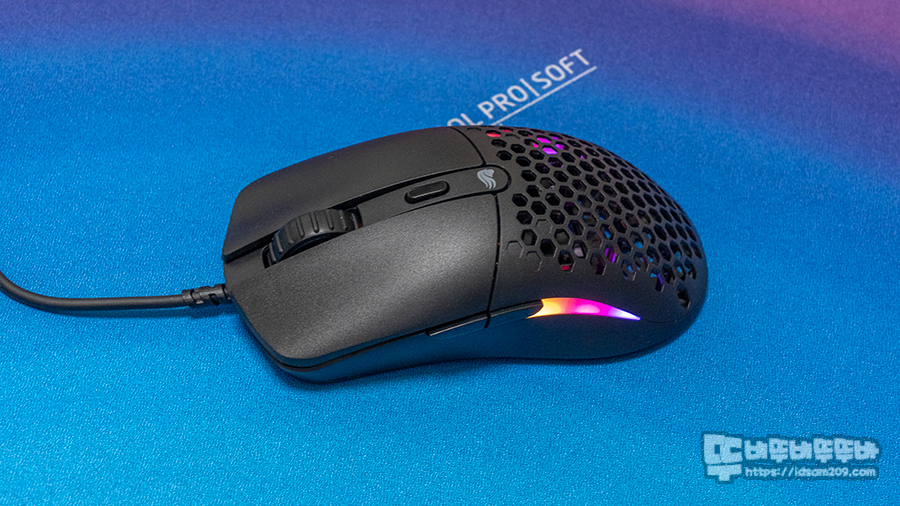 넓게 디자인된 메인 버튼과 휠 다이얼, DPI 변경 버튼 그리고 사이드 버튼으로 구성된 심플한 구조를 가지고 있으며 허니콤 디자인이 적용된 상하판 덕에 장시간 게임을 하더라도 손바닥에 습기가 느껴지지 않네요.