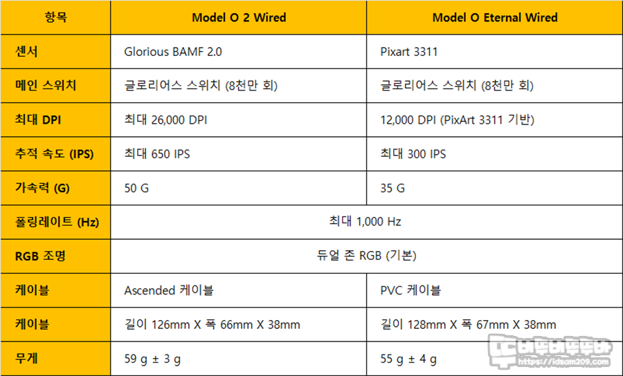이전 모델인 Model O2 유선 모델과 Model O Eternal 유선 모델의 스펙 정보를 비교해 보니 라이트 하게 나오는 제품이라 그런지 고사양 센서보다는 실용적인 Pixart 3311 센서로 최대 12,000 dpi를 지원하며 동일한 크기이지만 무게는 55g 가벼워진 게 특징이며 기존의 파라코드라고 불리는 가볍고 유연한 케이블에서 PVC 소재로 변경된 것을 확인할 수 있습니다.