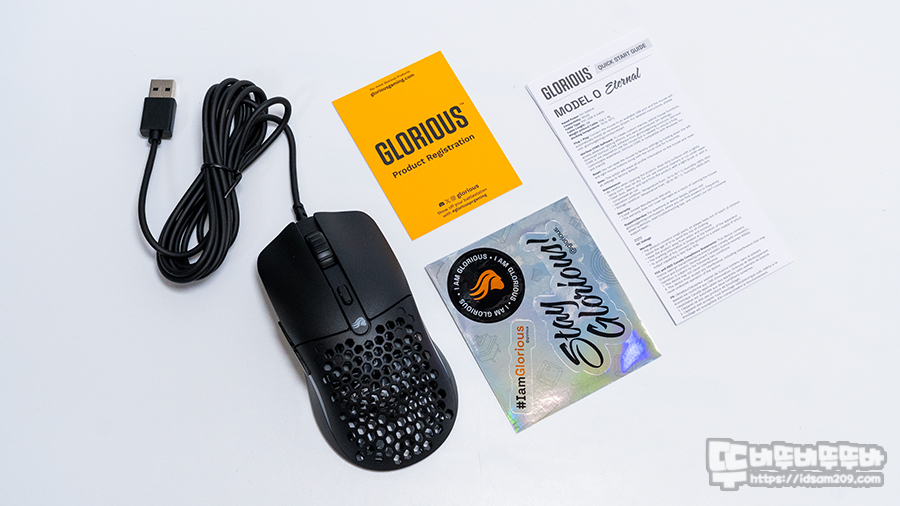 제품은 Model O Eternal 마우스 본체와 브랜드 스티커, 간단 안내서 그리고 정품 등록 안내 카드 등으로 구성되어 있습니다.