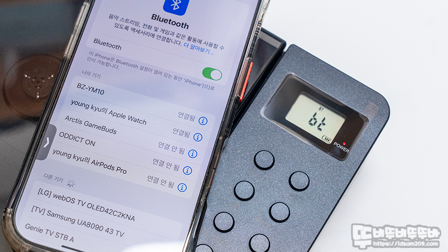 블루투스 모드에서 페어링 버튼을 눌러 페어링 진행 시 스마트폰의 "BZ-YM10" 명칭을 선택하면 페어링이 되며 최초 페어링 이후에는 블루투스 모드 선택 시 자동으로 페어링이 되는 오토 페어링으로 사용하게 됩니다.