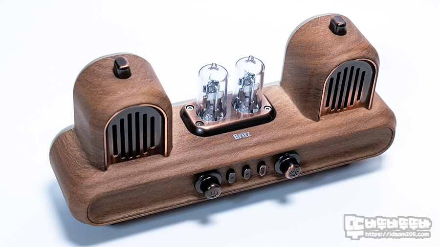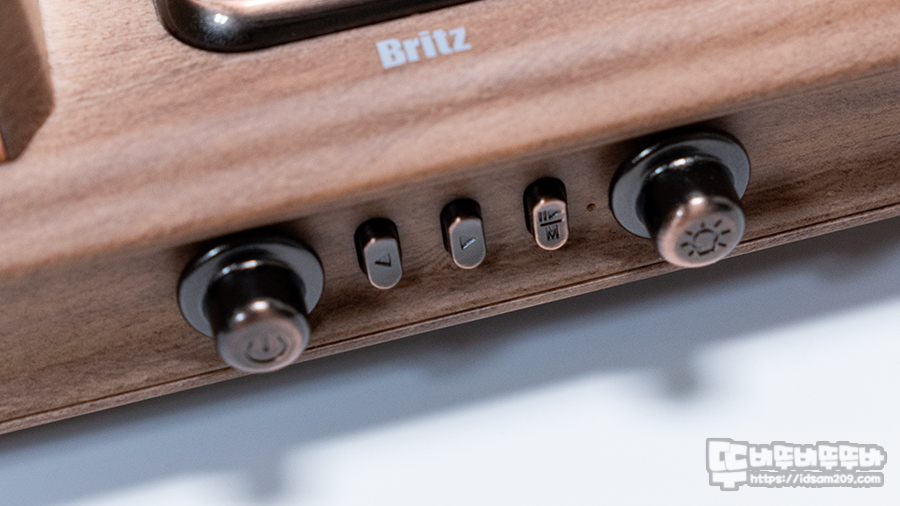 브리츠 BZ-MK330는 흡사 개구리를 정면에서 보는 귀여운 느낌을 주는데 나무 무늬 스킨과 오래된 황동 느낌의 컨트롤 다이얼과 버튼 그리고 스피커 그릴, 중앙에 뭔가 중요한 역할을 할 거 같은 진공관 느낌의 무드램프가 조합되어 옛스러운 느낌을 잘 살려줍니다.