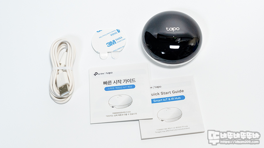 제품은 Tapo H110 허브 본체와 USB-C to A 전원 케이블, 3M 양면테이프, 퀵 스타트 가이드로 구성되어 있습니다.