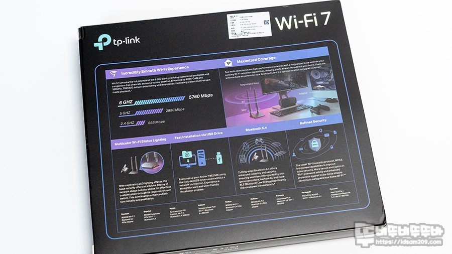 패키지 뒷면에는 중복되는 내용 이외 Wi-Fi 상태 표시 LED 효과, USB 드라이버를 통한 빠른 설치, 블루투스 5.4 (BLE), 향상된 보안 기능을 강조하고 있습니다.