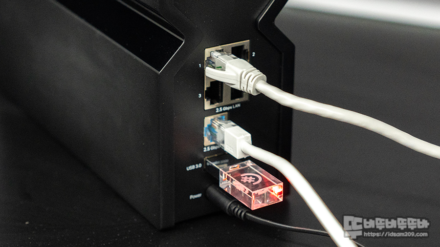제품 뒷면에는 2.5 Gbps WAN포트 1개, 2.5 Gbps LAN 포트 4개, USB 3.0, 전원 소켓, 리셋 버튼, 전원 On/Off 스위치로 구성되어 있으며 USB 3.0 포트를 이용하는 USB 메모리 또는 외장하드를 이용하여 네트워크 저장 서버 구축으로 클라우드 못지않게 편리하게 활용할 수 있습니다.