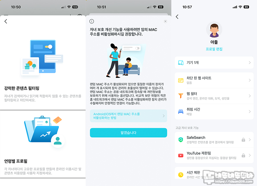 '가족' 메뉴의 자녀 보호 설정에서는 연령별 프로필 및 사용 기기 등록 후 요일별 사용 시간제한, 웹 필터링 및 웹 사이트 제한 등이 가능한데 이러한 제한 설정은 자녀와의 대화를 통해 서로 합의된 부분에 대해서만 적용하여 아이가 스스로 사용 시간을 지키도록 유도하고 최후의 보루로 사용하는 것이 좋습니다.