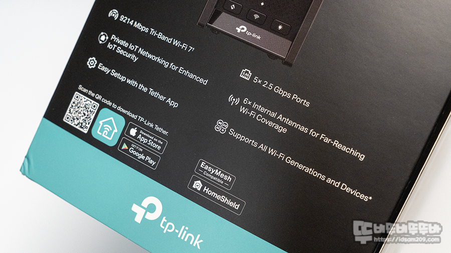 패키지에는 Wi-Fi 속도를 강조하는 BE9300 그리고 9214Mbps 속도로 3.6배 빠른 Wi-Fi 속도, 최소한의 버퍼링으로 지연 시간 단축으로 부드러운 Wi-Fi, 360도로 광범위한 커버리지, 2.5Gbps 랜포트 5개 지원으로 유무선으로 빠르고 완벽한 멀티기기 연결성 그리고 포브스 선정 No.1 브랜드, 3년 무상이라는 부분도 티피링크의 트레이드 마크처럼 표현되어 있습니다.