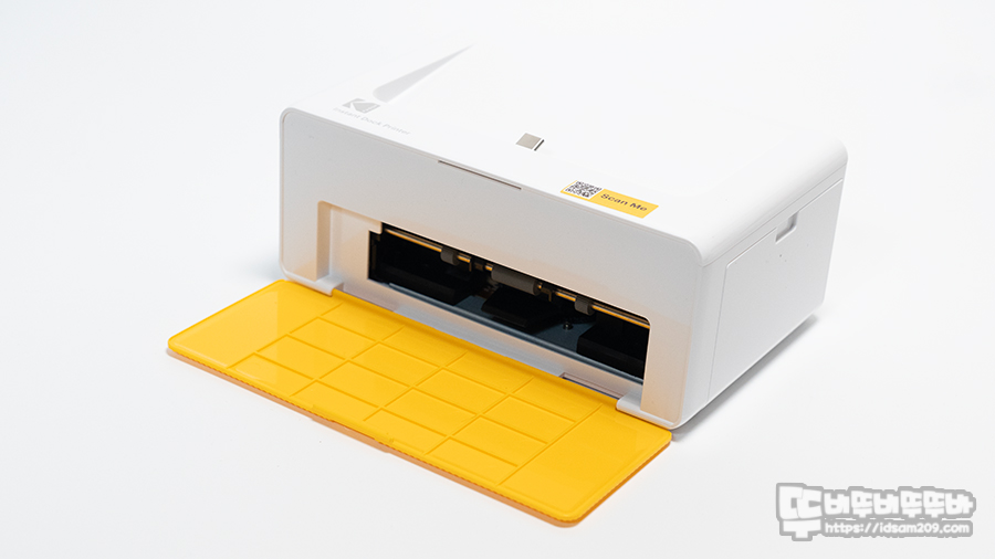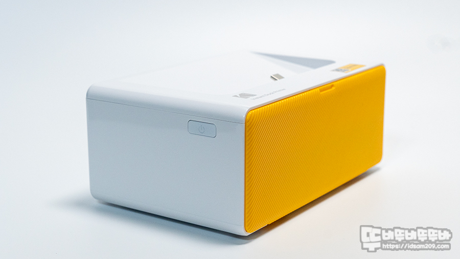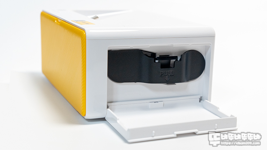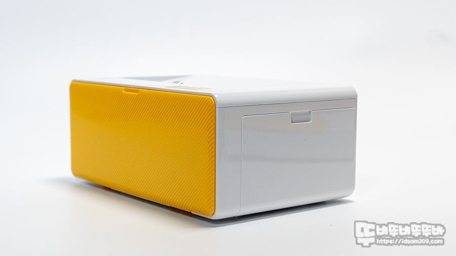 DP640 코닥 도크플러스 레트로 포토프린터기는 169 X 109 X 70mm 사이즈로 전면에 옐로우 컬러 커버는 프린트 용지 트레이를 장착하는 부분이며 제품의 왼쪽에 LED 라이팅으로 제품의 상태를 표현하는 전원 버튼이 위치하고 있습니다.