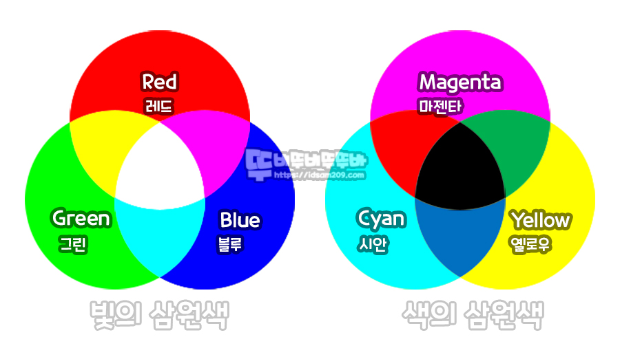색의 삼원색은 M(마젠타), C(시안), Y(옐로우)가 합쳐지면 블랙이 되는 구성으로 대표적인 예로 물감, 페인트, 잉크류가 사용되는 제품에서 응용되어 사용됩니다.
