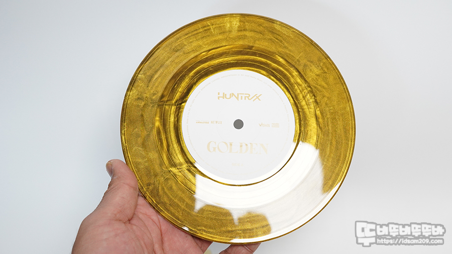 먼저 7인치 싱글 골든 Vinyl입니다. 헌트릭스 멤버와 전용 전세기 이미지와 A, B 트랙 리스트가 적혀있는 재킷을 확인할 수 있고요.