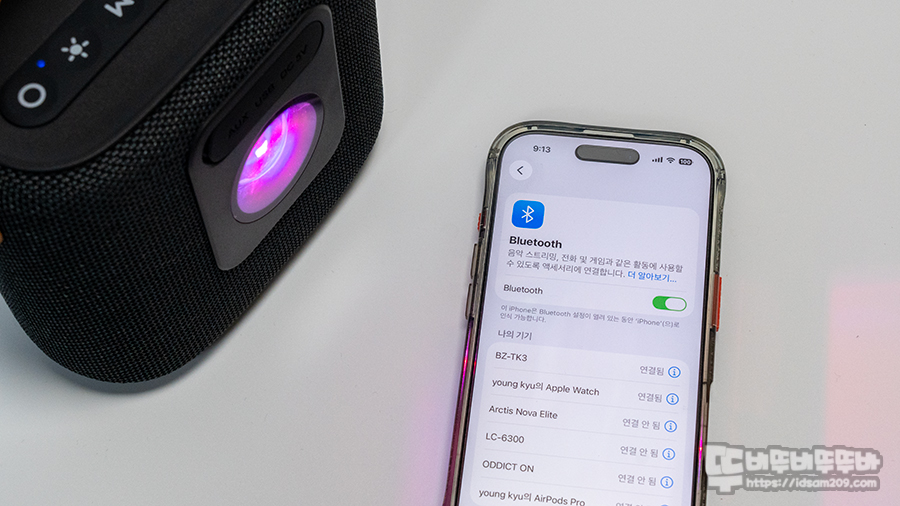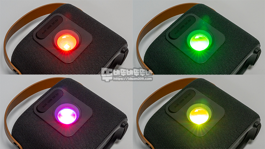 핸드 스트랩이 기본으로 장착되어 있어 휴대성, 편리한 조작성, IPX4 생활방수, USB 메모리를 이용한 MP3 플레이, 외부 사운드를 입력받는 AUX, LED 무드등 지원, 깔끔하고 심플한 디자인으로 멀티플레이로 활용하기에 군더더기 없는 제품인 거 같습니다.