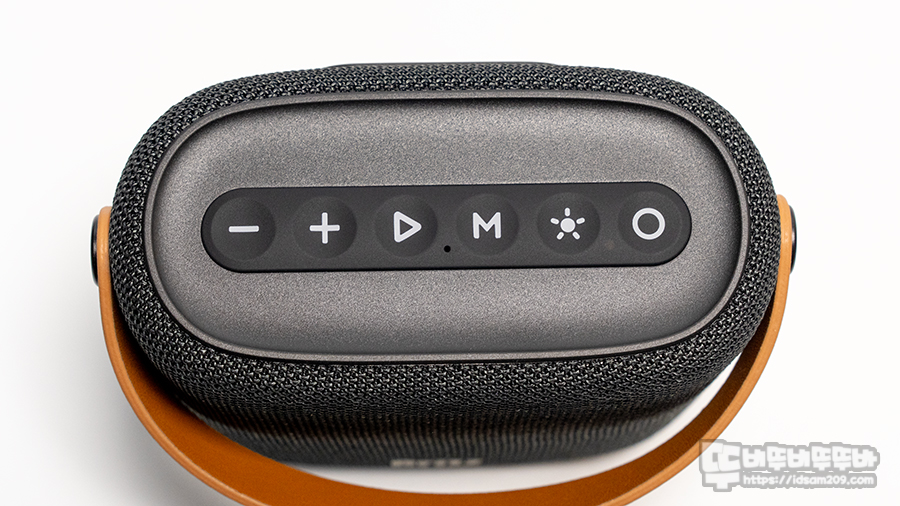 상단에 위치한 메인 컨트롤 구성은 큰 원형 디자인의 직관적인 도형이 각인된 버튼 방식으로 +, - 버튼은 짧게 볼륨, 길게 트랙이동, ▶ 버튼은 재생, 일시정지, M 버튼은 입력 모드 변경, LED 무드등 버튼은 짧게 LED On/효과 변경, 길게 LED Off, 그리고 전원 버튼으로 구성되어 있습니다.