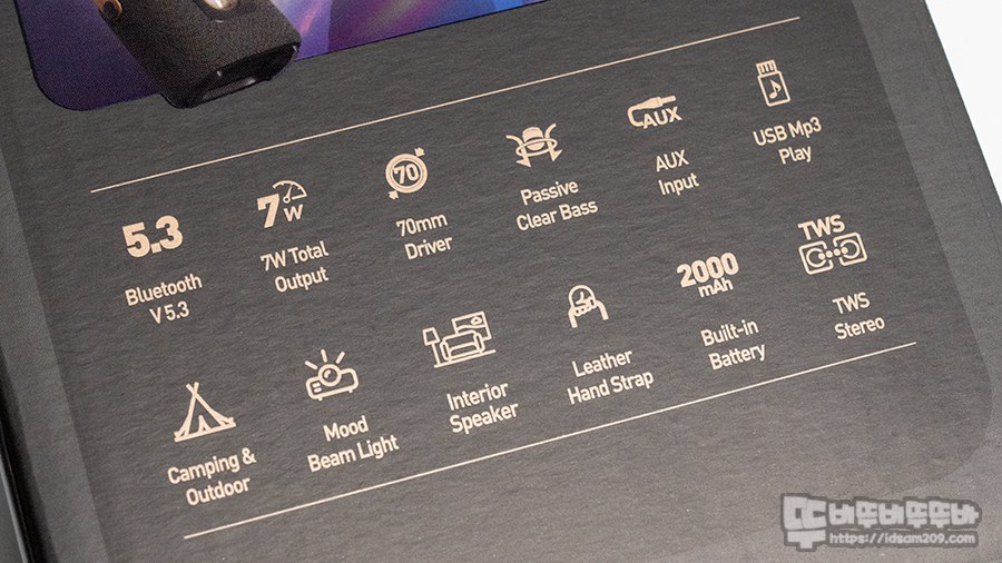블루투스 버전 : 블루투스 5.3 / 드라이버 유닛 : 70mm / 출력 정격 : 7W / 패시브 라디에이터 내장 / 입력 : 블루투스, USB, AUX /