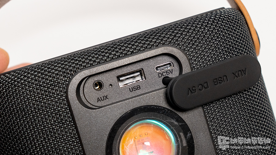 LED 상단에 실리콘 캡으로 덮여있는 포트 부분은 IPX4 생활 방수를 지원하며 포트 구성은 3.5mm AUX, LED 인디케이터, USB 메모리 단자, DC 5V USB-C 충전 단자로 구성되어 있습니다.
