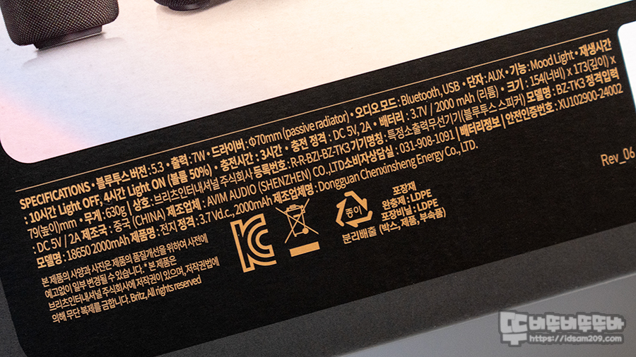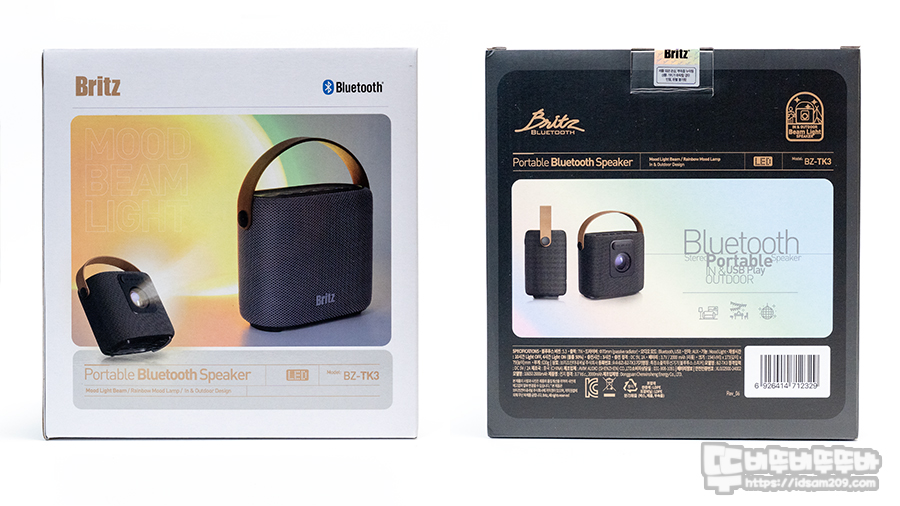 브리츠 BZ-TK3 블루투스 스피커 패키지는 제품의 특징인 포터블 스피커와 LED 무드등 기능 지원을 잘 표현하고 있는데요.