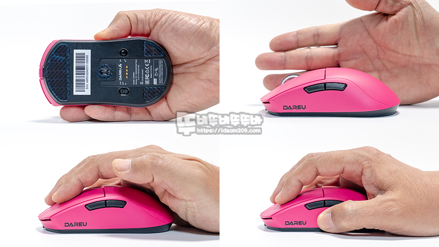 전체적으로 마우스 쉐입이 손바닥에 눌리지 않는 부드러운 아치형 디자인에 좌우 폭이 64mm로 넓은 편이라 그립 시 좌우가 꽉 차는 느낌이 좋으며, 어떤 형태의 후아노 스위치인지 모르지만 저압 느낌으로 가볍게 클릭이 가능합니다.