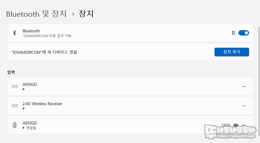 3 모드 연결을 지원하기에 유선으로 연결 시 A950GD, 2.4GHz 연결 시 2.4G Wireless Receiver, 블루투스 연결 시 A950GD 기기명을 확인할 수 있으며 블루투스 연결 시 배터리 상태를 표현하는 아이콘을 확인할 수 있습니다.