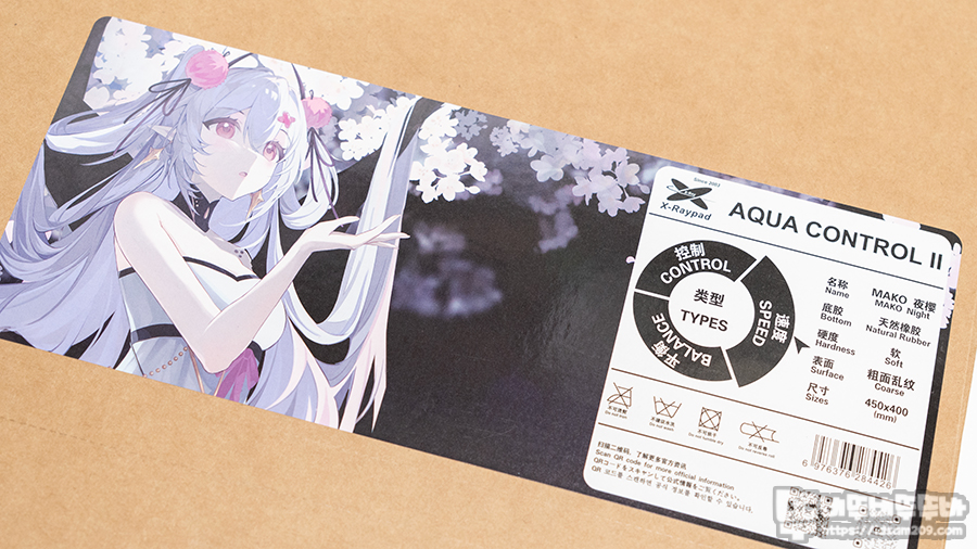 아쿠아컨트롤2 Mako 사쿠라 에디션 게이밍 마우스 패드 패키지는 무지박스에 마코 캐릭터가 인쇄되어 있으며, 패키지 뒷면 라벨에는 제품의 스펙 정보를 확인할 수 있는데요.