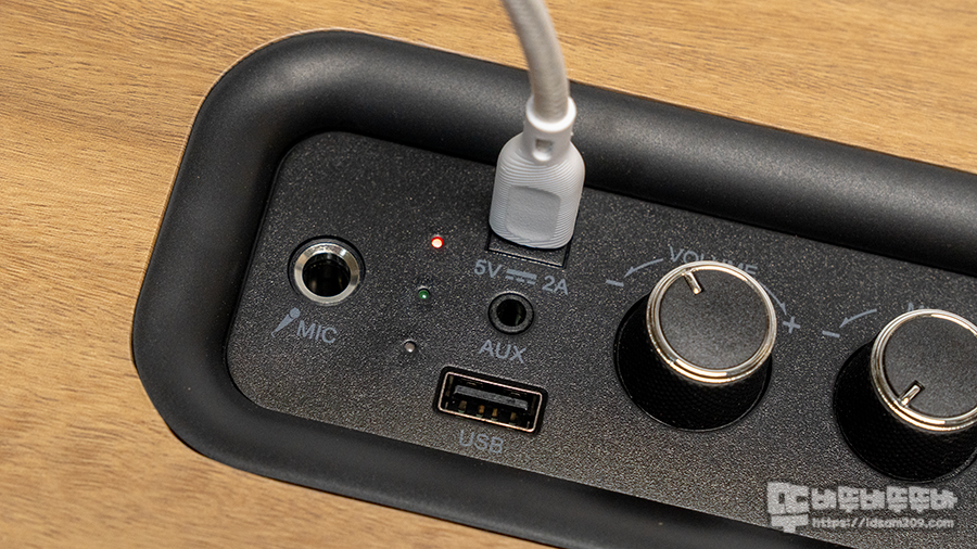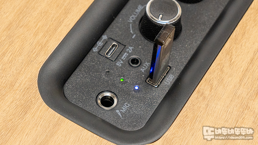 제품 상단의 컨트롤 패널 모습을 살펴보면, 가장 오른쪽에 토클방식의 전원 스위치, 미디어 재생/트랙이동, 빨리 감기, M 모드 변경 버튼, 메인볼륨, 마이크 볼륨, 에코 볼륨으로 구성된 노브 그리고 USB-C 충전단자, 3.5mm AUX 입력 단자, USB-A 메모리 단자, LED인디케이터, 6.5mm 마이크 단자를 확인할 수 있습니다.