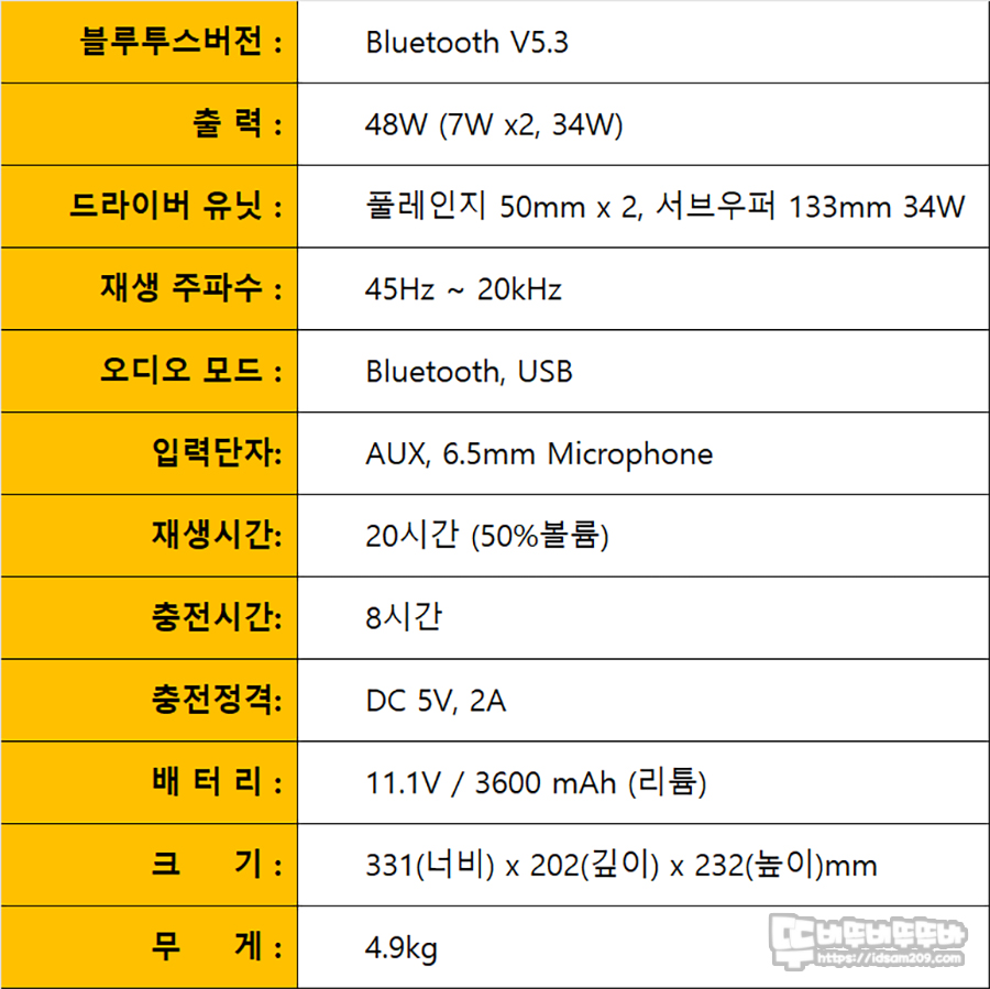 사운드: 2.1채널 (133mm 서브 우퍼 + 50mm 풀레인지 유닛 x2), 출력: 최대 48W 고출력, 연결: 블루투스 5.3, USB 메모리, 3.5mm AUX, 6.5mm 마이크 입력, 배터리: 3,600mAh 내장 (약 8시간 충전 / 최대 20시간 재생), 디자인: MDF 우드 캐비닛 & 패브릭 그릴 등의 내용을 확인할 수 있습니다.