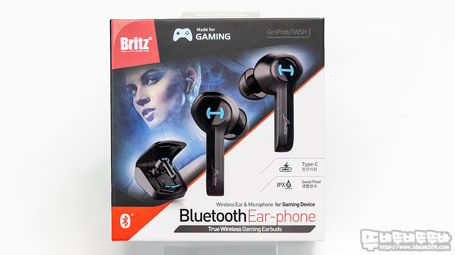 브리츠 GmPodsTWSH 게이밍 블루투스 이어폰 패키지 전면 모습입니다.