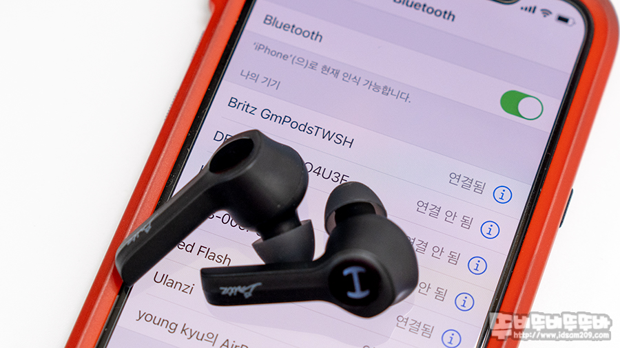 페어링은 오토페어링을 지원하는 제품답게 충전 케이스에서 이어버드를 꺼내면 자동으로 페어링 모드로 진입하게 되며 스마트폰 블루투스 기기 리스트에 등장하는 " Britz GmPodsTWSH "를 선택하여 페어링을 해주면 됩니다.