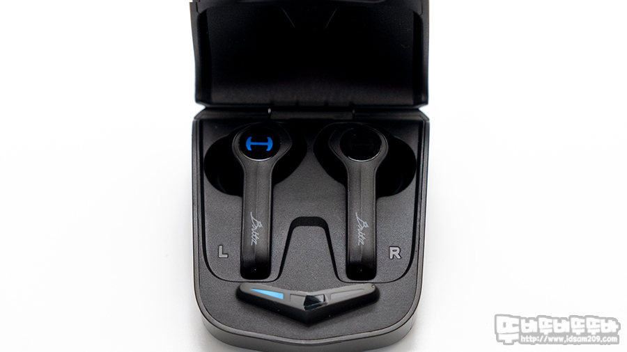 브리츠 GmPodsTWSH의 충전 케이스는 보통에 이어버드처럼 세로로 꼽는 방식이 아닌 눕혀서 장착하는 방식이기에 케이스가 조금 크게 느껴지며 스포츠카를 연상시키는 샤프한 디자인 그리고 하늘색 느낌의 LED 인디케이터와 브리츠의 시그니처 로고가 돋보입니다.
