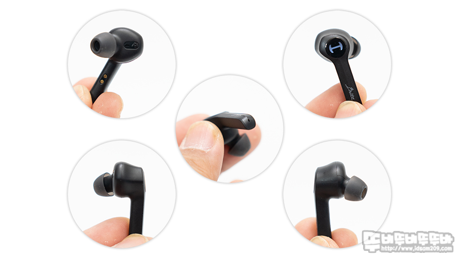 이어버드는 인이어 타입 베이스에 귀 뒤쪽 부분이 돌출되어 이어훅을 겸하는 디자인이 특징이며 충전 단자가 있는 스틱 끝 부분에는 음성통화를 위한 마이크가 내장되어있습니다.
