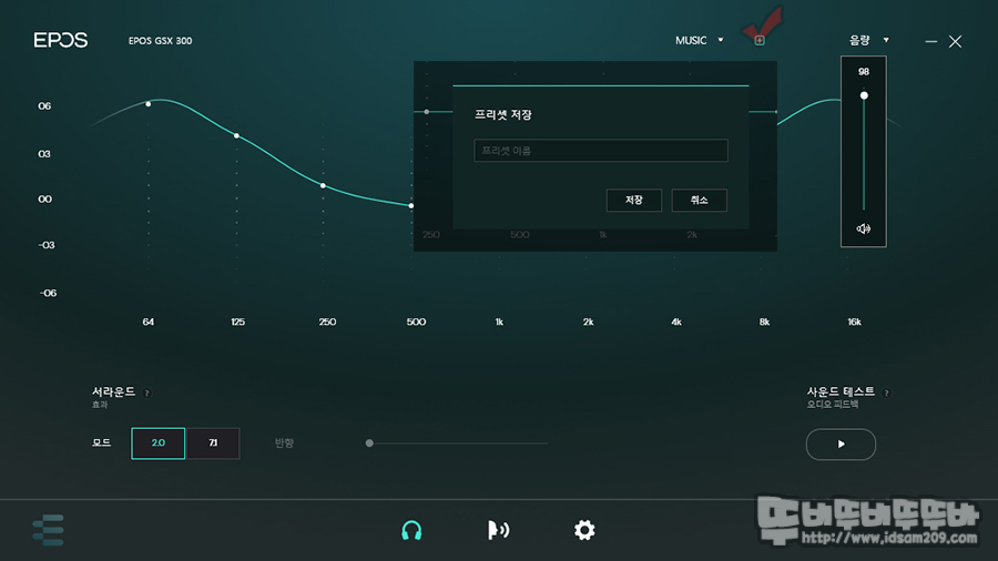 각각의 EQ 설정이 되어있지만 이를 변경하여 사용자의 취향에 맞는 프리셋으로 저장도 가능하며