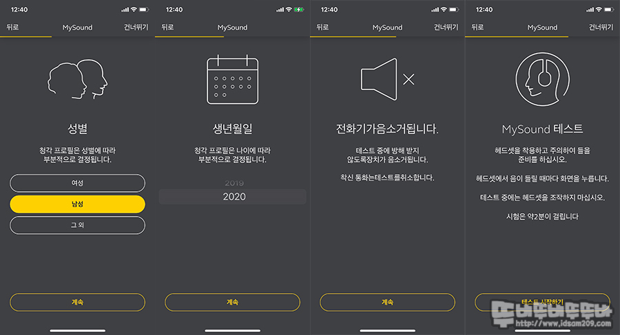청력은 나이와 반비례하기에 세팅 시작 전 출생 연도를 선택을 시작으로 다양한 주파수 대역의 소리를 왼쪽과 오른쪽 개별 테스트로 설정을 이어 나가며 미세한 소리를 들어야 하기에 주변 소음이 없는 조용한 공간에서 진행하시기 바랍니다.