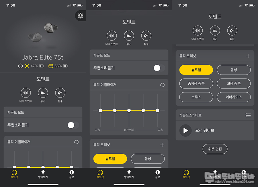 이퀄라이저는 사용하지 않은 상태에서도 고음과 중저음이 밸런스가 좋은 사운드를 들려주었지만 Sound+ 앱을 이용한 뮤직 프리셋 기능 또는 커스터 마이징된 프리셋을 이용하면 획일적인 사운드를 들려주는 블루투스 이어폰과 다르게 섬세한 사운드 변화를 느낄 수 있었습니다.