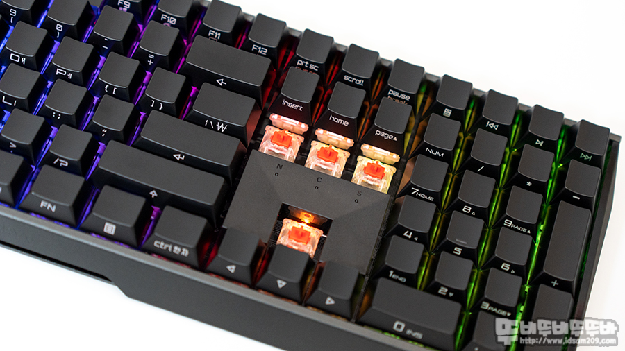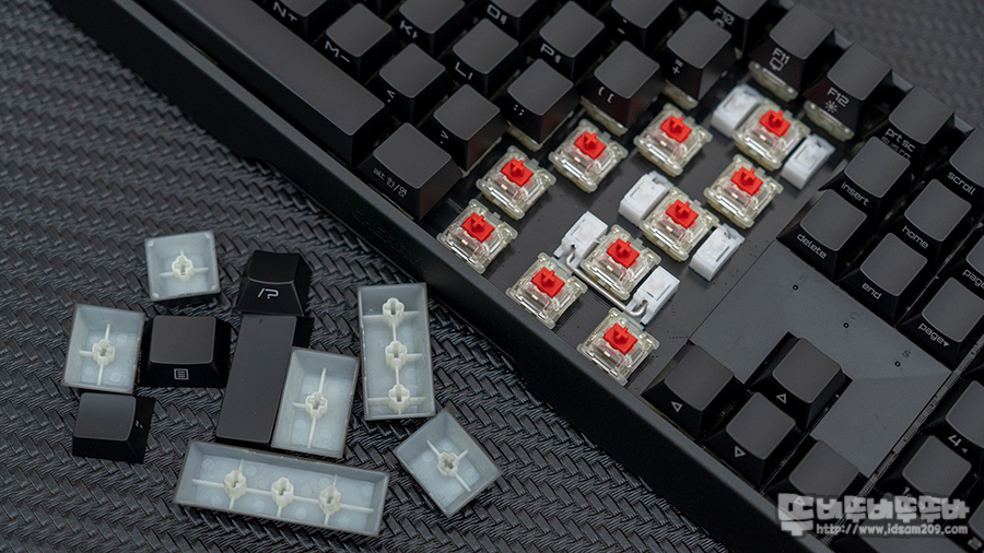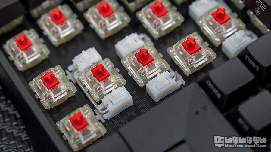 체리 MX RGB 스위치는 역방향으로 장착되었으며 키캡 분리 시 스테빌라이저가 뽑히지 않는 새롭게 디자인된 스테빌라이저가 사용되었으며 스테빌라이저의 잡 소음이 들리 않게 윤활처리가 기본으로 되어있습니다.
