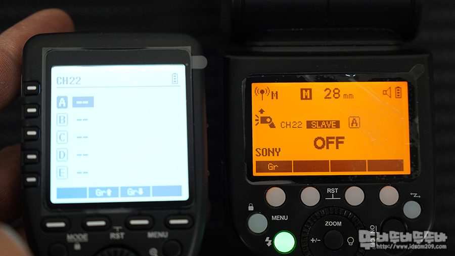고독스 Xpro s 켜놓은 상태에서 고독스 V1을 슬레이브 모드로 전환 후 메뉴 버튼을 이용하여 SCAN을 합니다.