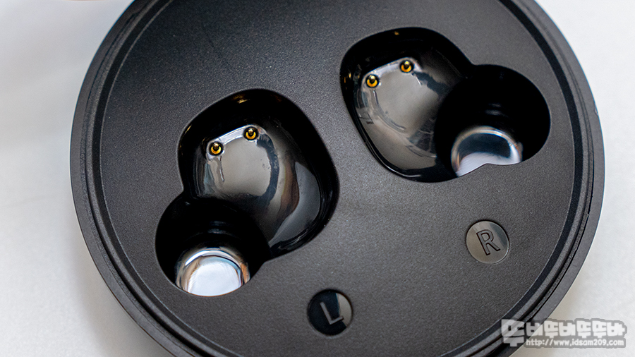 이어버드를 수납할 수 있는 충전 케이스는 충전을 담당하는 2개의 충전 핀과 자석을 이용하여 이어버드를 수납하게 되는데요. 좌우를 구분하는 L, R 각인이 되어 있어 이어버드를 쉽게 충전할 수 있게 디자인돼있습니다.