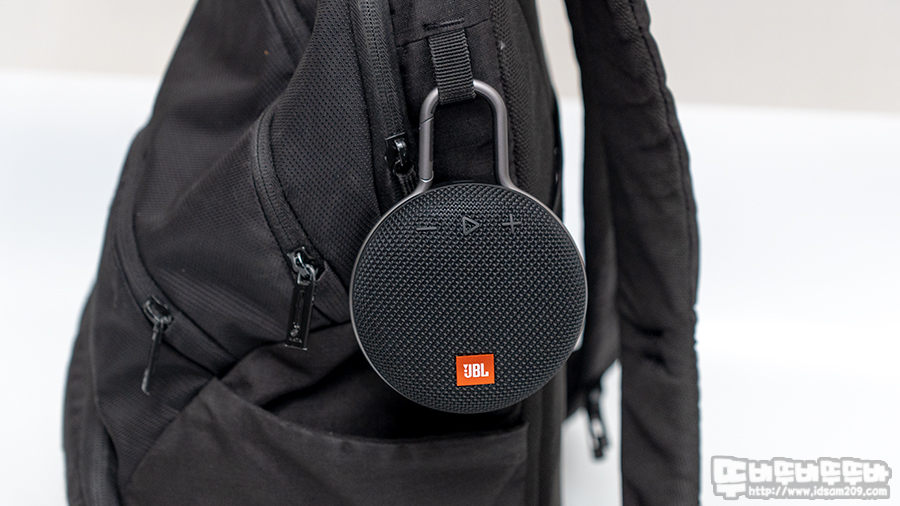 JBL CLIP3 블루투스 스피커를 살펴보면 카리비너 클립과 메탈 프레임이 일체형으로 디자인된 외각 프레임에 원형으로 디자인된 스피커가 결합된 상태로 스피커 전면에는 - / ▷ / + 컨트롤 버튼과 바닥면에는 미끄럼 방지 패드가 적용되었는데요.