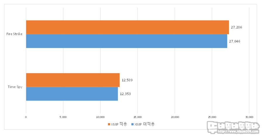 벤치 테스트 시 XMP 적용 전과 적용 후를 비교해보면 약 Fire Strike는 0.8%, Time Spy는 1.9%의 성능 향상이 눈에 띄었습니다.