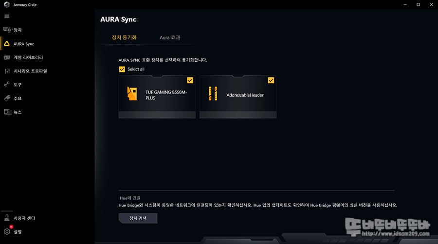 Armoury Crate 설치 후 AURA Sync을 살펴보면 AURA Sync를 지원하는 장치 리스트에서 메인보드와 메모리 동기화 설정 또는 메모리만 다른 RGB LED 효과를 적용할 수 있는데요.