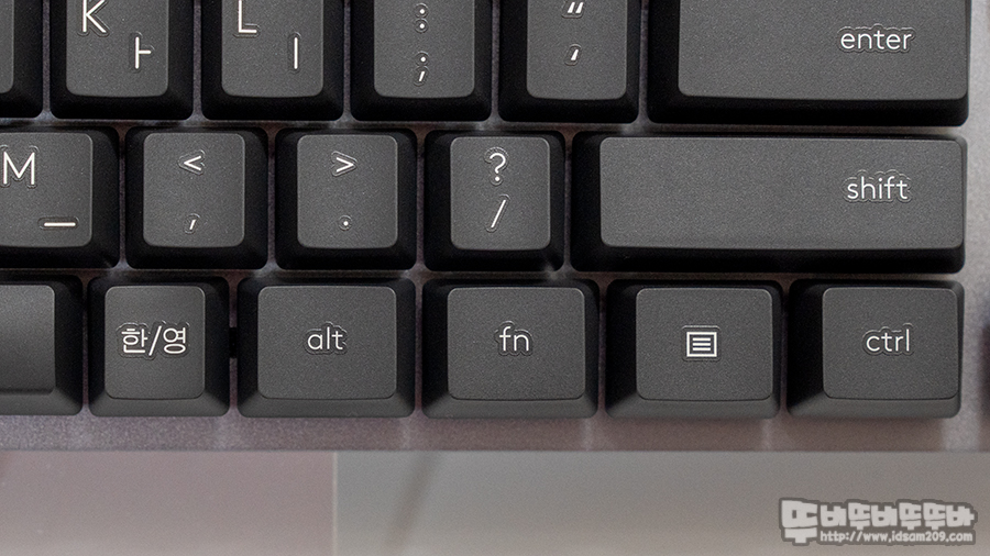 키캡의 각인은 요즘 기계식 키보드에서는 좀처럼 보기 힘든 오일리스 코팅 방식으로 각인이 적용되었습니다.