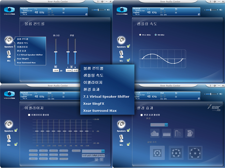 스피커 메뉴에서는 아무래도 가상 7.1 채널에 관련된 7.1 Virtual Speaker Shifter 활성화와 Xear Surround Max 활성화가 포인트일 거 같습니다.