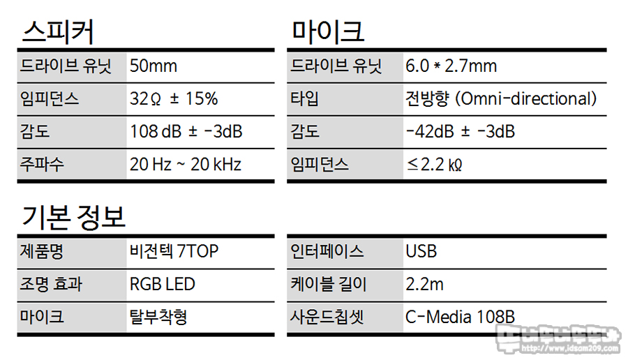 대구경 50mm 드라이브, 6.0 x 2.7mm 고감도 탈착형 마이크, 자동으로 표현되는 RGB LED, C-Media 108B 칩셋으로 구현하는 가상 7.1 채널 사운드를 지원하는 제품입니다.