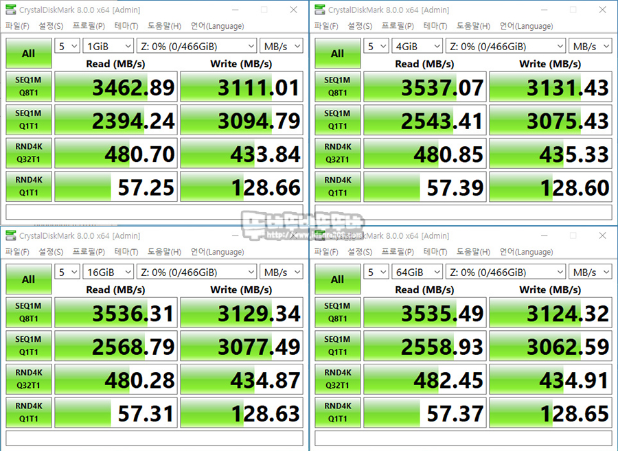 CrystalDiskMark 테스트는 테스트 용량을 1 / 4 / 16 / 64 GiB로 변경하여 테스트해보았는데요.