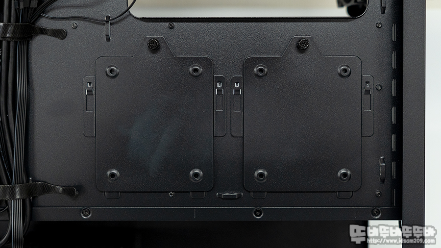 샤시 후면에는 2.5인치 SSD 장착이 가능한 2개의 브라켓을 기본으로 제공하며 하단 파워서플라이 챔버에는 HDD & SSD 장착이 가능한 가이드를 제공하고 있습니다.