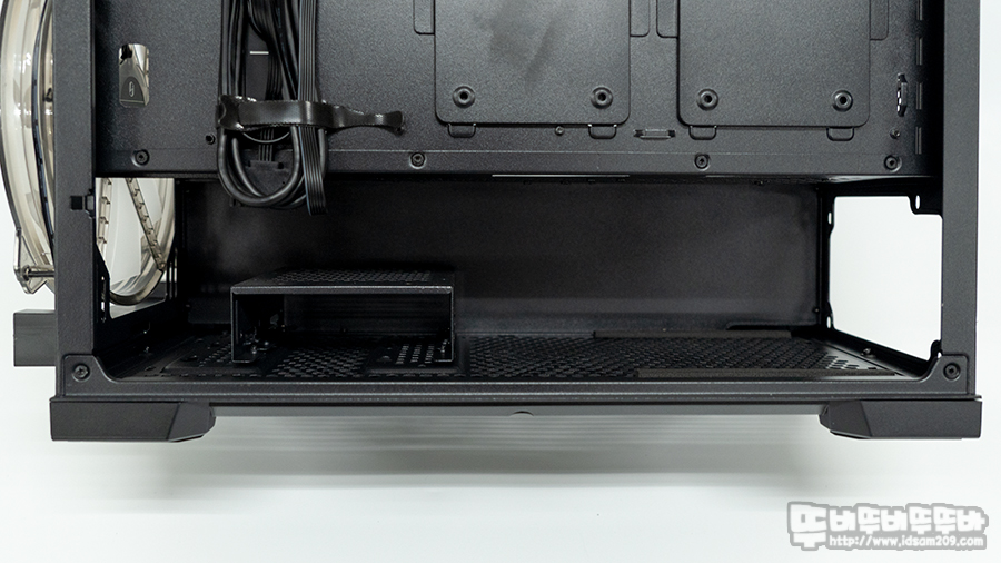 특히 바닥면에 고정되는 HDD 가이드는 고무 와샤를 이용하여 슬라이딩으로 체결되는 방식으로 탈부착이 쉬우며 전면 수냉 쿨러, 파워서플라이 크기에 따라 HDD 가이드 위치를 앞뒤로 조정이 가능합니다.