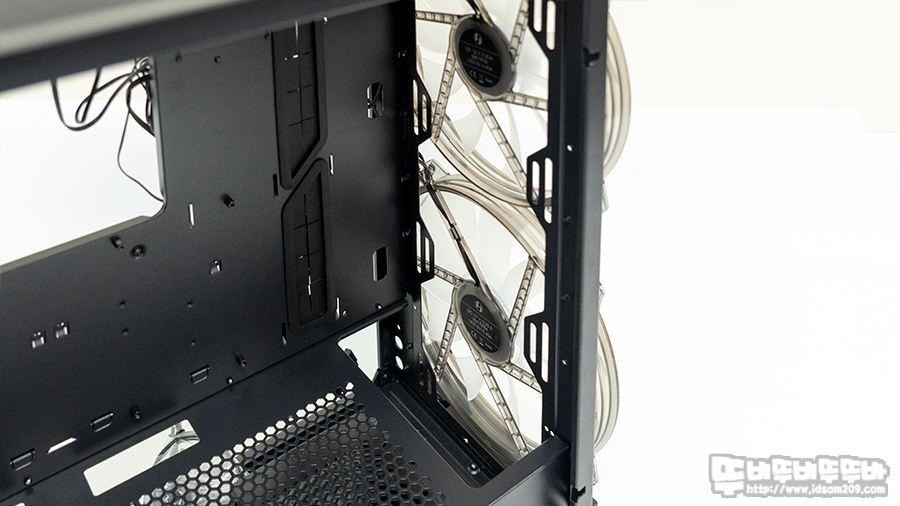 ITX / M-ATX / ATX / E-ATX 메인보드를 수용할 수 있는 넉넉한 샤시 면적을 가지고 있으며 샤시 뒤쪽에서 안쪽으로 케이블이 넘어오는 홀에는 고무 그로밋을 사용하여 케이블이 깔끔하게 보이게 고정하고 가려주는 역할을 합니다.